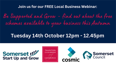 We'll also hear from Taunton Chamber of Commerce members Cosmic, who are delivery partners for the Somerset Start Up and Grow scheme, about the upcoming business support options they have on offer including: