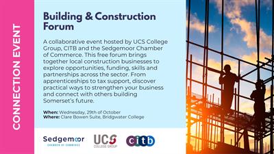 A collaborative event proudly hosted by UCS College Group, CITB, and the Sedgemoor Chamber of Commerce. Under the banner “Uniting Construction, Skills and Support”, this forum brings together local construction businesses to explore opportunities, share insights, and strengthen partnerships across the region. Discover how these three organisations are working together to support workforce development, champion industry growth, and connect businesses with the resources they need to thrive. Whether you’re a contractor, supplier, educator or stakeholder in the built environment, this event is your gateway to meaningful collaboration and community impact.
